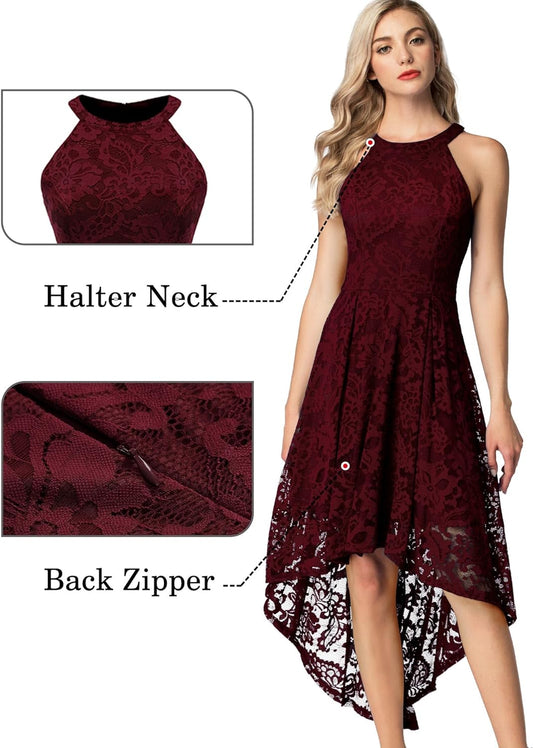 Women'S Halter Floral Lace Cocktail Party Dress Hi-Lo Bridesmaid Dress